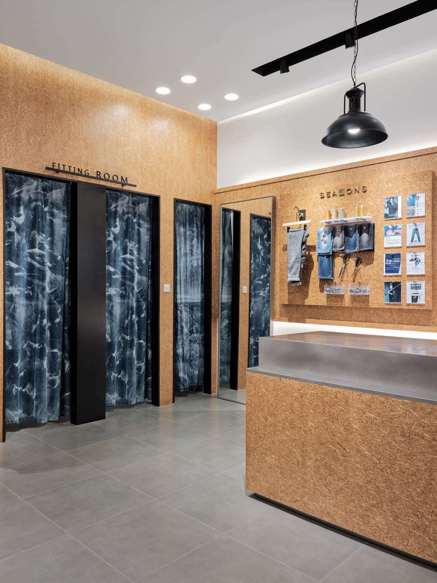 设计师在空间调性定位时,为了贯彻牛仔自由、随性、不羁的品牌风格,选择了简约现代的风格。